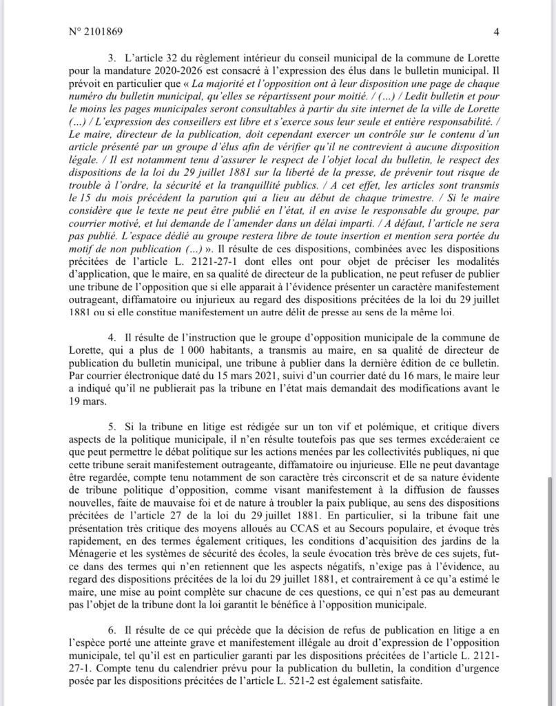 Plus grave le juge précise que « le refus de la publication ( ICI ) a en l’espèce porté une atteinte grave et manifestement illégale au droit d’expression de l’opposition »