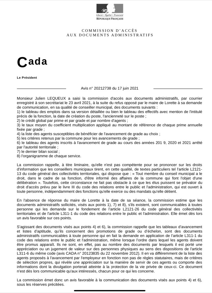 Dès la réception de cet avis, j’ai donc de nouveau demandé au Maire de Lorette, l’accès à ces documents que l’administration doit, dans le mois qui suit la notification de cet avis, fournir.