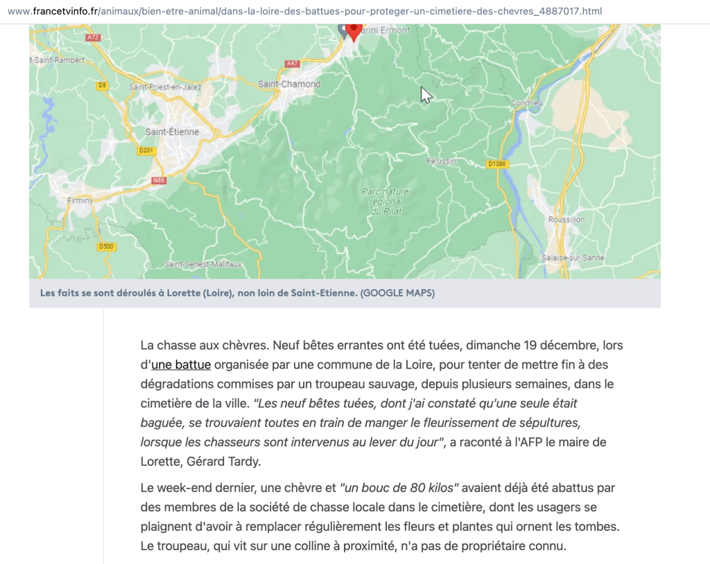 Avant la battue du dimanche 19 décembre reposant sur un arrêté « litigieux » du maire et finalement abrogé depuis le 27 décembre après l’abattage des 9 chèvres, un évènement est passé quasi inaperçu. Celui d’une première expédition punitive qui a eu lieu, d’après les déclaration du maire Gérard Tardy à l’AFP, le week-end des 11 et 12 décembre et qui aurait fait d’après lui l’objet d’un abattage « d’une chèvre et d’un bouc de 80kg » comme le reprenait un article de France Info ou encore celui du Progrès en date du samedi 18 décembre.