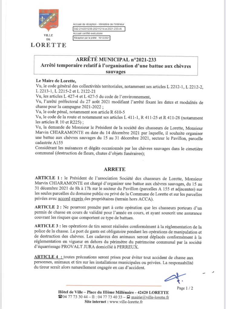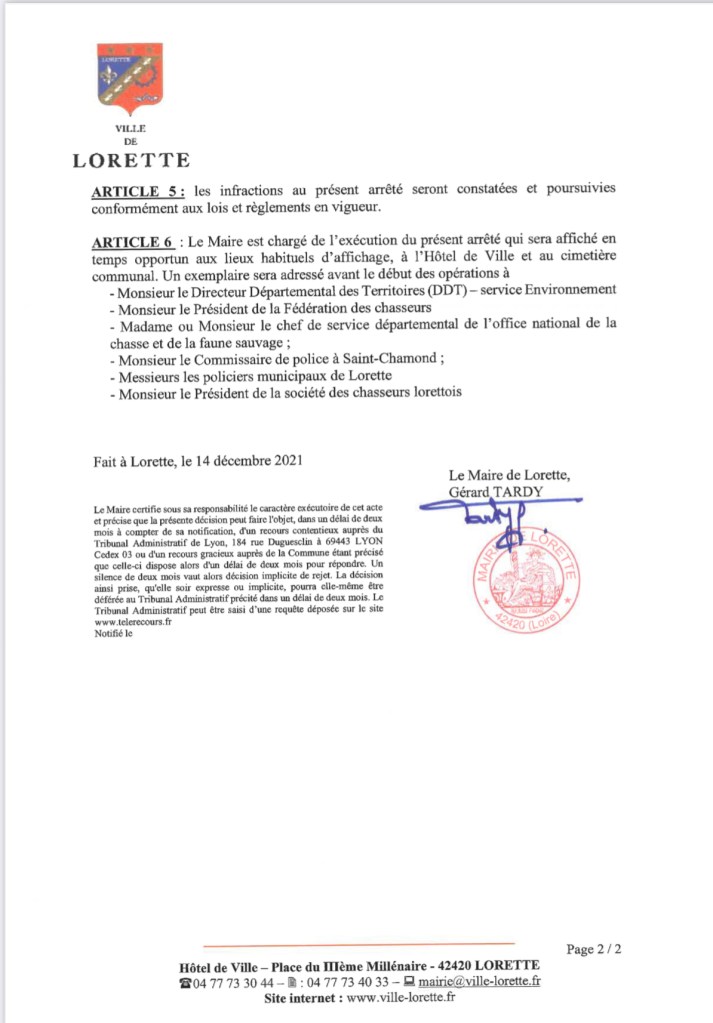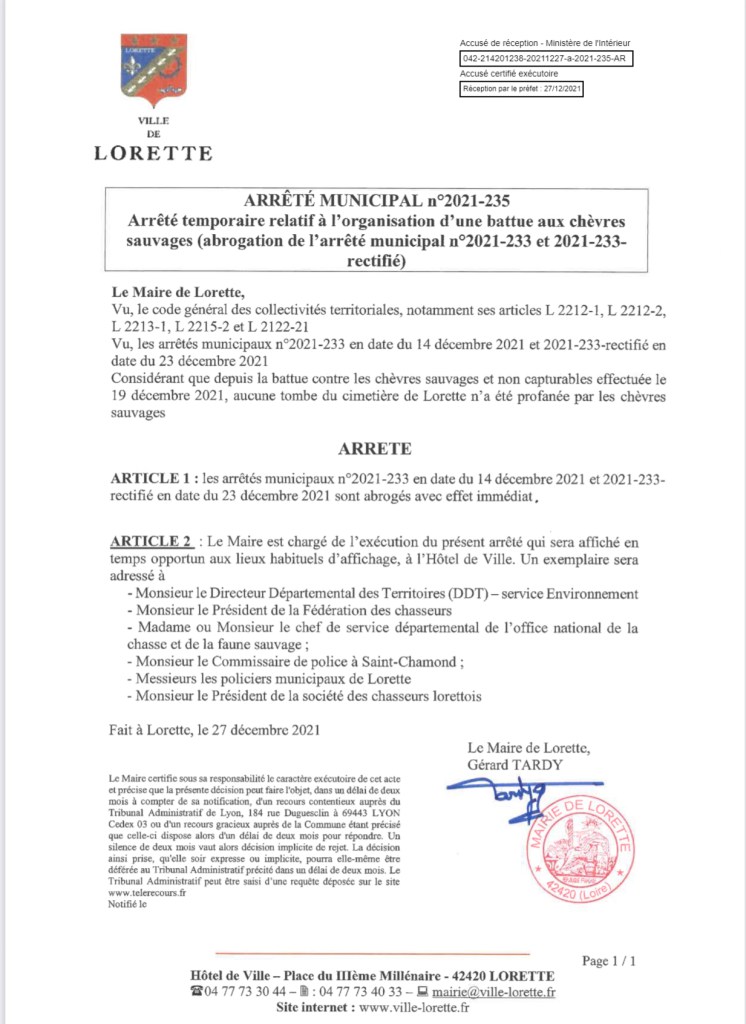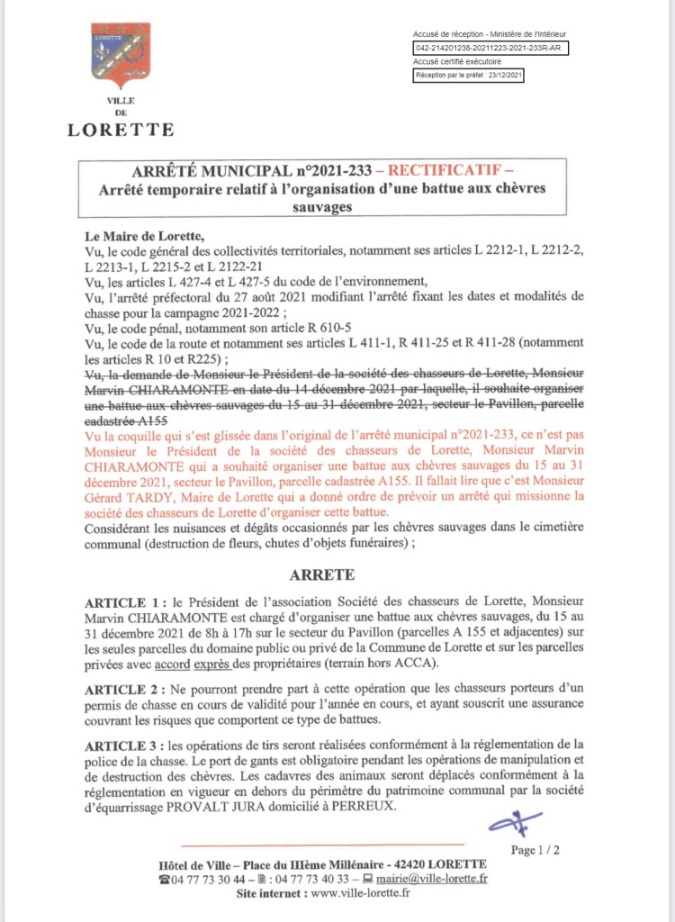 Sollicités par les élus d’opposition qui souhaitaient savoir dans quel cadre cette première battue avait été organisée, le directeur général des services de la commune a transmis hier un mail à 15h51 avec seulement 3 arrêtés officiels pris par Monsieur le Maire Gérard Tardy. Le premier en date du 14, un second rectificatif en date du 23 décembre 2021, et enfin le dernier en date du 27 décembre (hier) qui abroge la battue qui courait jusqu’au 31 décembre 2021.