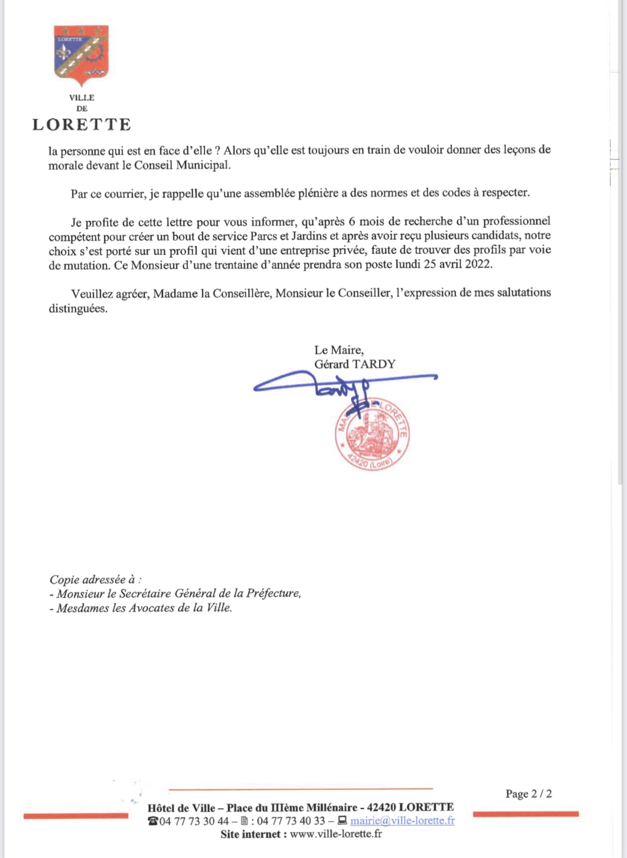 Mais plutôt que de faire profil bas, ce dernier ose une nouvelle fois, attaquer les élus d’opposition dans un courrier adressé aux membres du conseil municipal, au Secrétaire Général de la Préfecture et aux avocates (sic) de la commune. Dans ce « torchon » dont vous pourrez prendre connaissance ci-dessous il fait non seulement preuve d’une extrême mauvaise foi, en réécrivant l’histoire à son avantage, mais surtout il brandit un « mensonge » inventé de toute pièce pour justifier sa décision incompréhensible de Mai 2020 (re sic) de retirer une délégation donnée à un élu 48h plus tôt. Certains membres d’Alliance pour Lorette l’ont d’ailleurs bien compris puisque depuis ils ont démissionné, alors que d’autres, dont l’éthique semble être mise de côté, ont apporté un soutien indéfectible au maire.