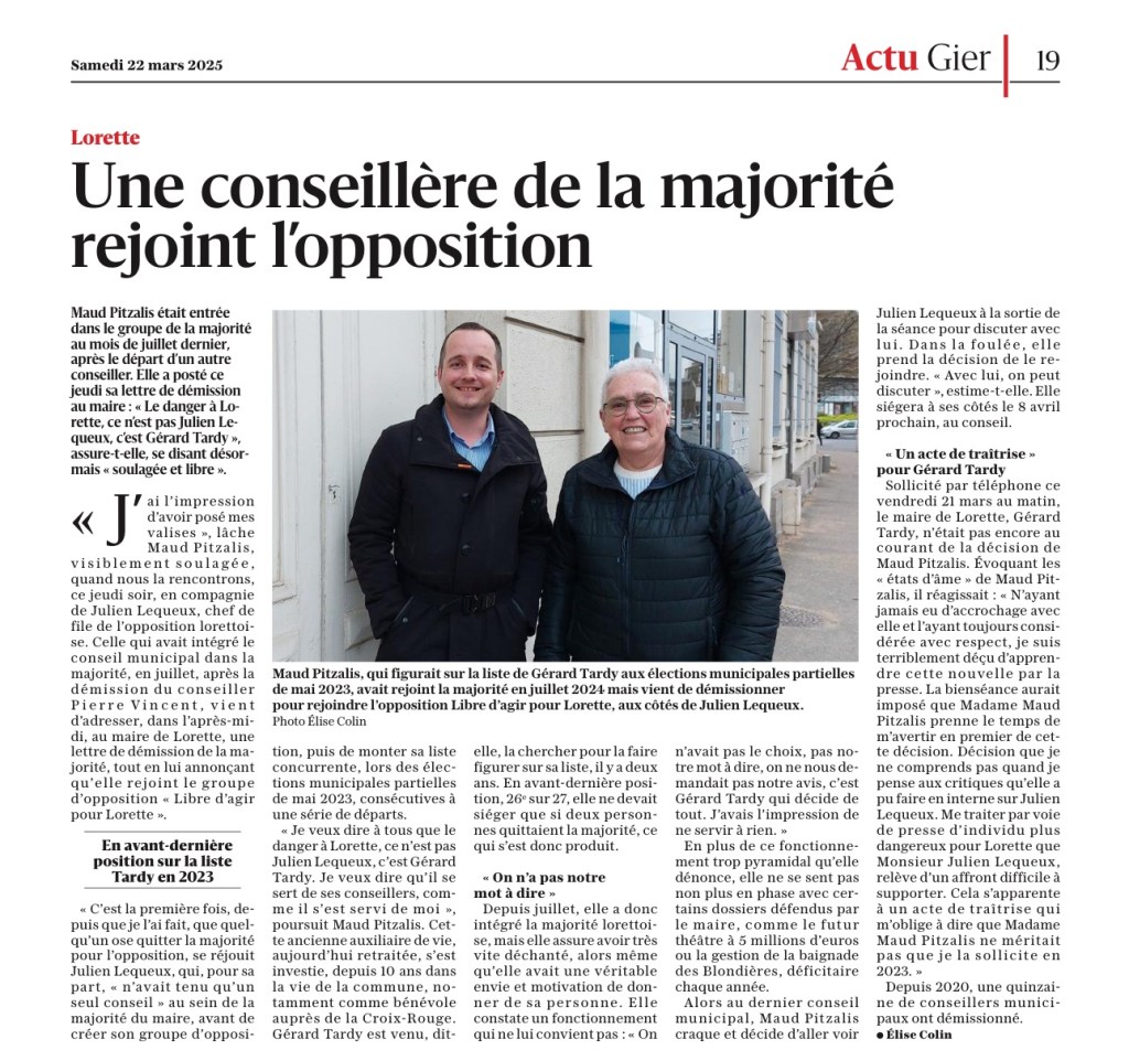 Et puis parce que je n’ai pas bcp de temps et que c’est finalement le plus important il y a les démissions extrêmement courageuses comme la mienne en 2020 ou celle de Mme Maud Pitzalis qui a bien compris, comme moi, que le danger c’est Gérard Tardy. Alors cher Maud, c’est avec un immense plaisir que toute l’équipe du groupe Libres d’Agir pour Lorette te souhaite la bienvenue dans les rangs de l’opposition.
