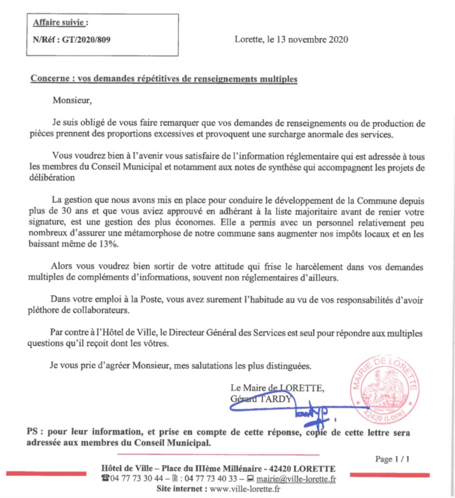 Avant même le début du dernier conseil le maire donnait le ton quelques jours plus tôt. Aux questions légitimes que je posais, les éléments fournis seulement 5 jours avant étant bien insuffisants pour se prononcer le jour du conseil, le maire m’adressait un courrier dont il a le secret : outrancier, invectivant et déplacé allant même jusqu’à faire référence à mon univers professionnel et m’ordonnant, pour résumé, d’arrêter de poser des questions et donc de jouer mon rôle de conseiller municipal. Particulièrement surprenant alors que son collaborateur direct, le directeur général des services m’indiquait le matin même être à ma disposition pour répondre à mes questions. Une situation schizophrénique.