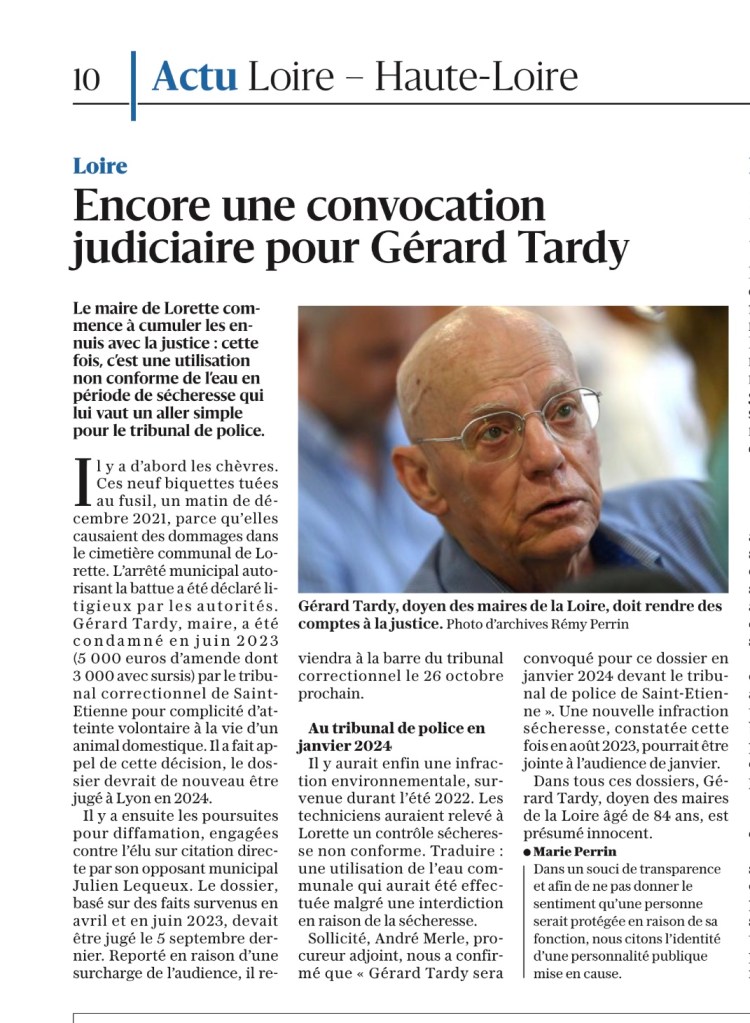 Toujours d’après Le Progres, Gérard Tardy sera encore convoqué, cette fois au tribunal de police, en Janvier 2024 pour avoir utilisé à l’été 2022 et à l’été 2023 de l’eau communale en pleine période de sécheresse ! Jusqu’où ira-t-il ?