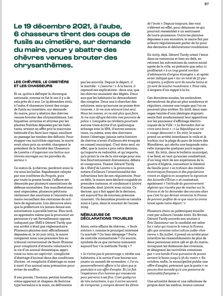 Voici aujourd’hui racontée par Le Progres l’histoire du maire Gérard Tardy, surnommé au procès par la procureure de la République « le shérif de Lorette ». L’homme, né en 1938, n’aime pas le désordre. Neuf chèvres, qui venaient grignoter les fleurs de son cimetière, l’ont payé de leur vie…⬇️⬇️⬇️⬇️⬇️⬇️