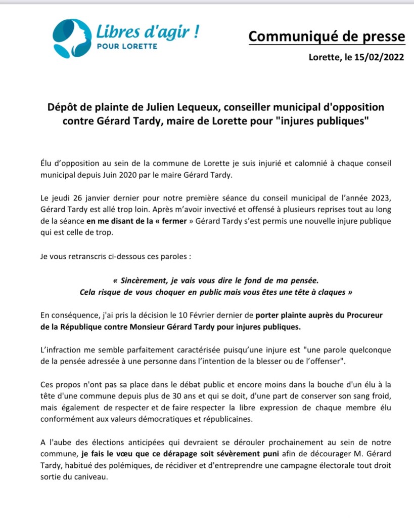 En effet à l’aube de futures échéances électorales importantes pour l’avenir de notre commune il n’est plus possible de laisser Gerard Tardy vouloir museler, et pire, insulter les élus d’opposition sans réagir. il est important de marquer dès maintenant les limites car nul doute que l’élu, visé sur son fauteuil de maire depuis plus de 30 ans, pourrait être tenté par une campagne électorale « au niveau du caniveau » alors que Lorette et les Lorettois méritent un débat démocratique d’un tout autre niveau.