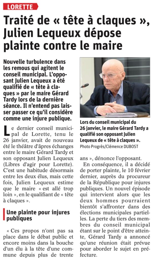 -lors du conseil municipal du 26 janvier, plus que jamais, Gérard Tardy a dépassé les bornes. En m’invectivant à plusieurs reprises en des termes particulièrement injurieux ( fermez la, vous êtes une tête à claques…) eu égard à ma fonction de conseiller municipal d’opposition que j’exerce bénévolement avec dignité et honnêteté. Ces propos pouvant être associés à des injures publiques j’envisage de porter plainte très prochainement auprès du procureur de la république.