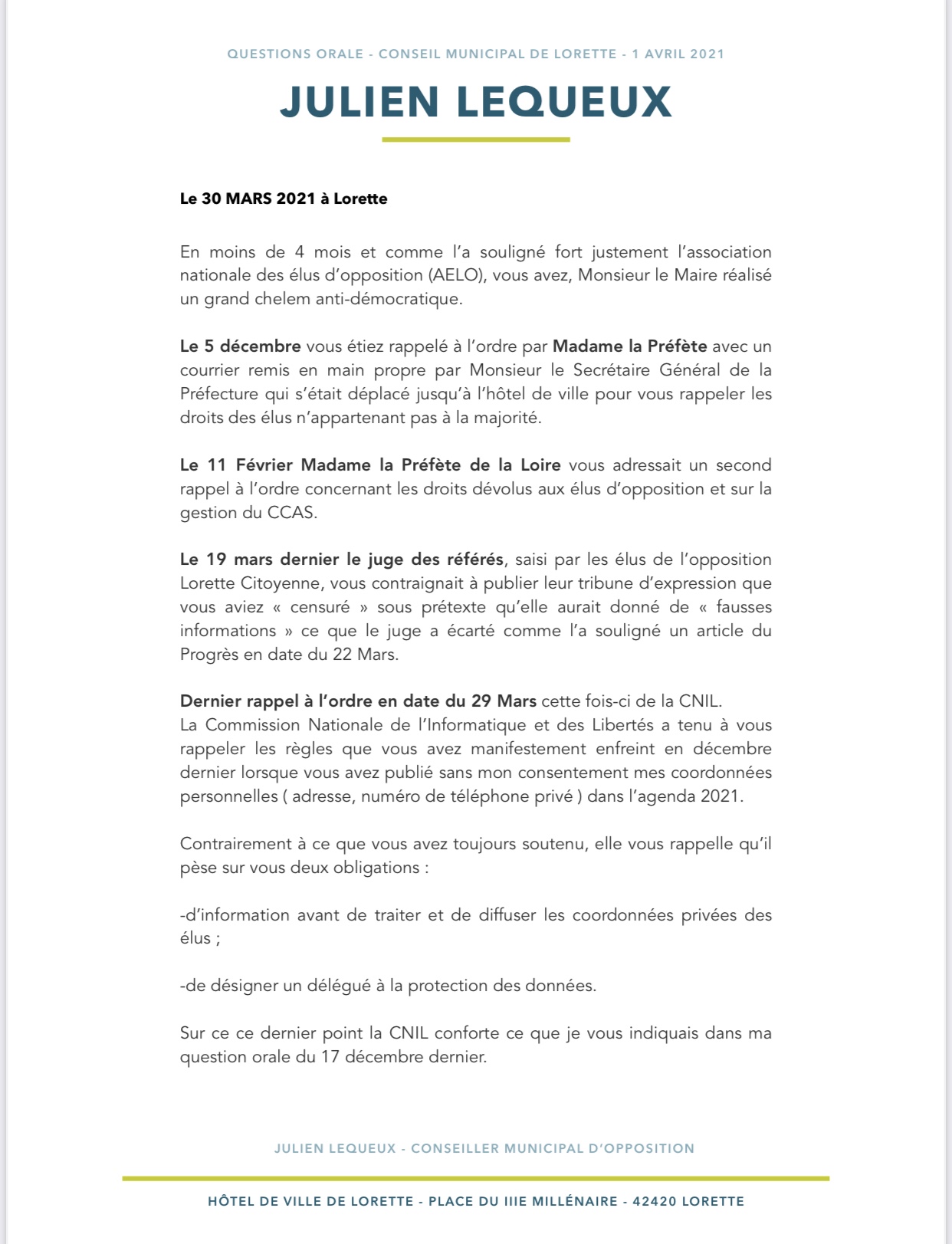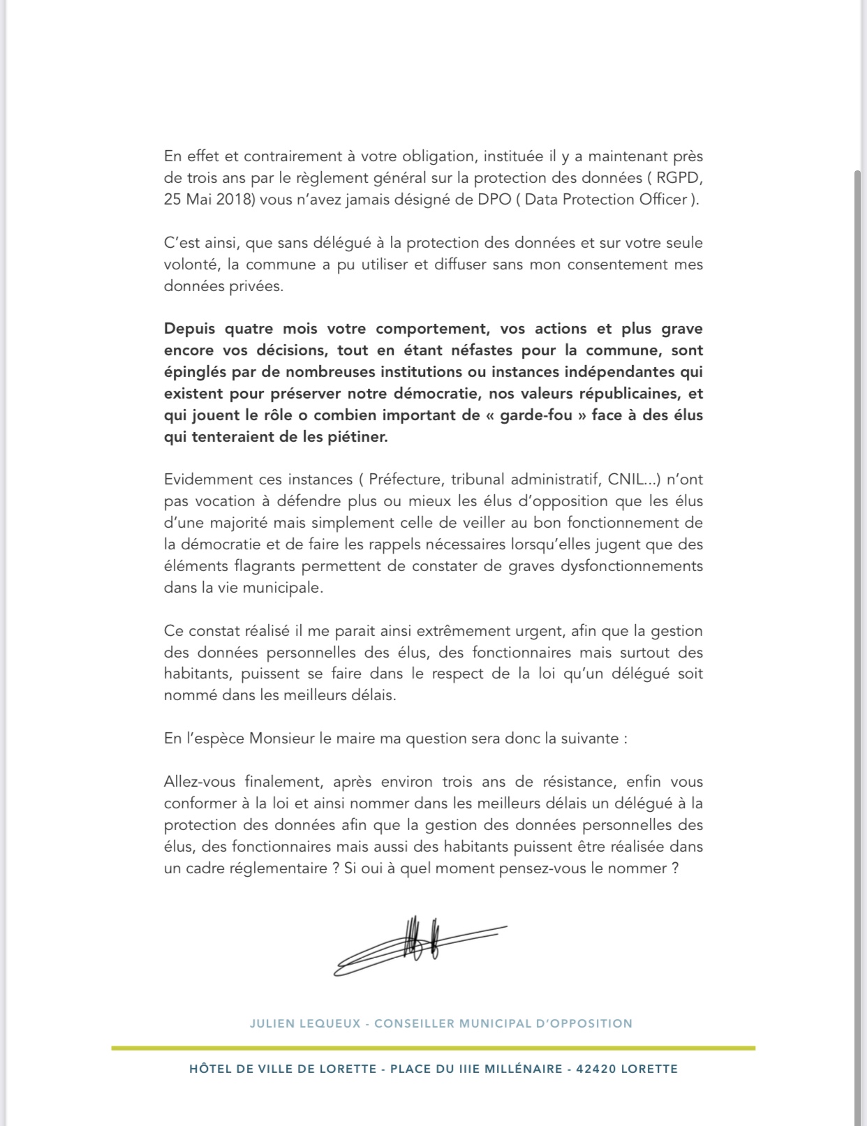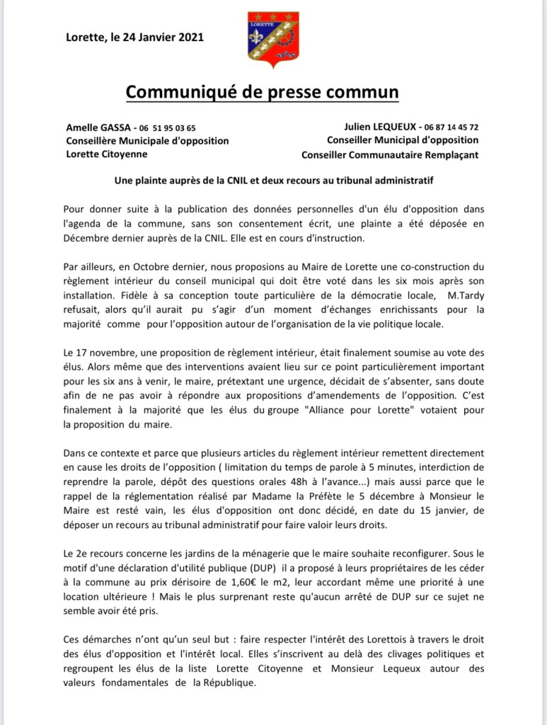 La sécurité des Lorettois est trop importante pour que je ne réalise pas un suivi de ce dossier. Si rien ne bougeait dans les prochaines semaines et que le maire faisait toujours défaut sur ce sujet, je mobiliserai les plus hauts représentants des Lorettois dans le département pour que cet espace puisse être sécurisé avec ou sans Gérard Tardy.